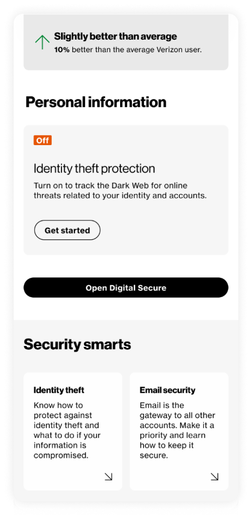Account users can track their security just like account owners. Their dashboard focuses on individual scores and personal settings. Unlike account owners, account users can only see their data. Verizon has a robust security offering. In testing, we learned that most users needed to learn what features or products were available to them. The dashboard encourages users to explore security features they may not have seen before the dashboard existed.
